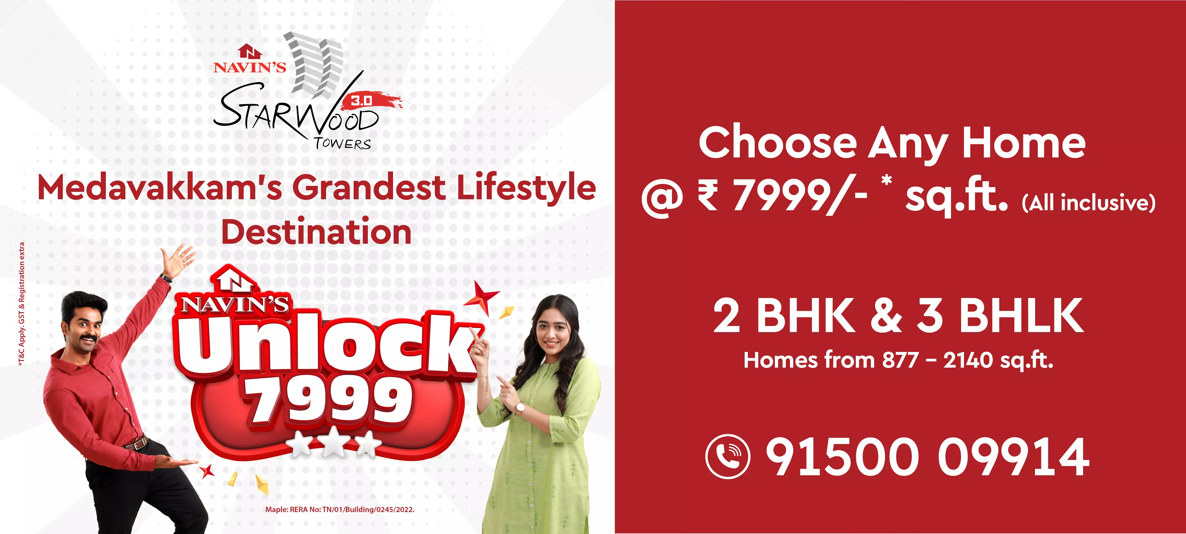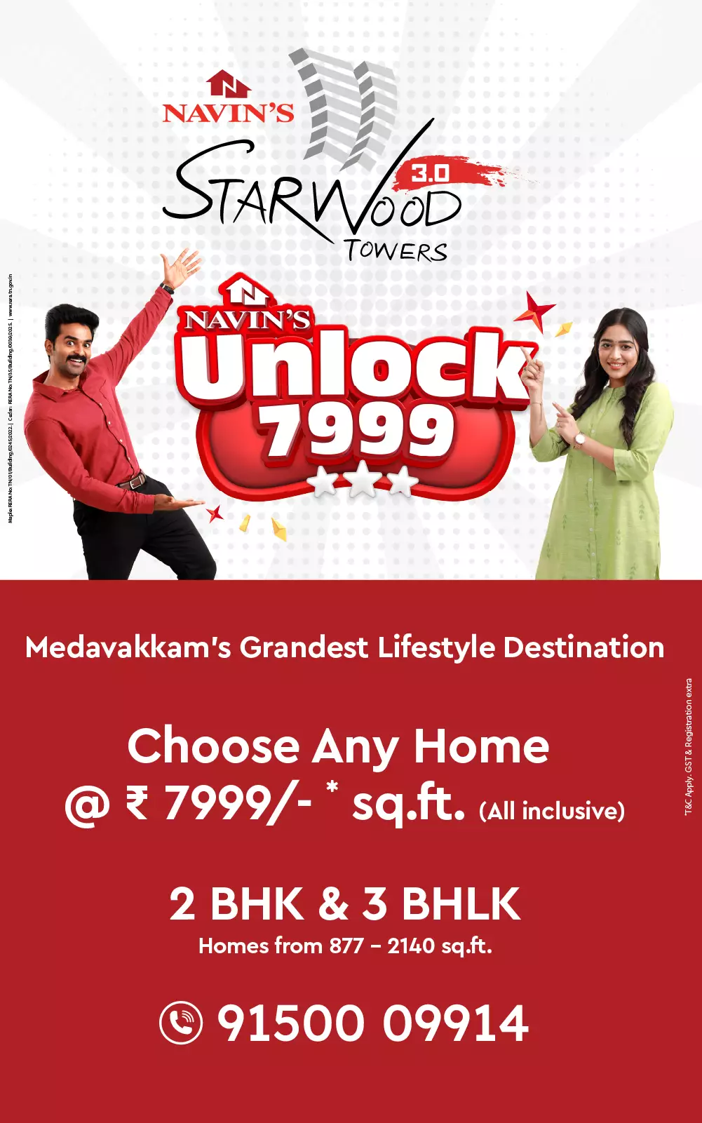 Navin’s proudly presents Starwood Towers, a fully equipped residential condominium with 958 apartments that is a mini vertical 14-floor township with basement plus stilts spread across eight towers. Located in Vengaivasal, equidistant between Velachery, OMR (IT Corridor) and Pallavaram, adjoining Medavakkam on the Mambakkam main road, Navin’s Starwood Towers comes to you with the latest Mivan construction technology, eco-friendly features, elegant architecture and design, a clubhouse, two commercial complexes featuring a bank, a departmental store, a clinic, a restaurant,a laundry , a salon and a host of other services. Truly a special niche, worthy of the Celebration of life. Navin’s Starwood Towers is a home you have been looking for and so richly deserve.
